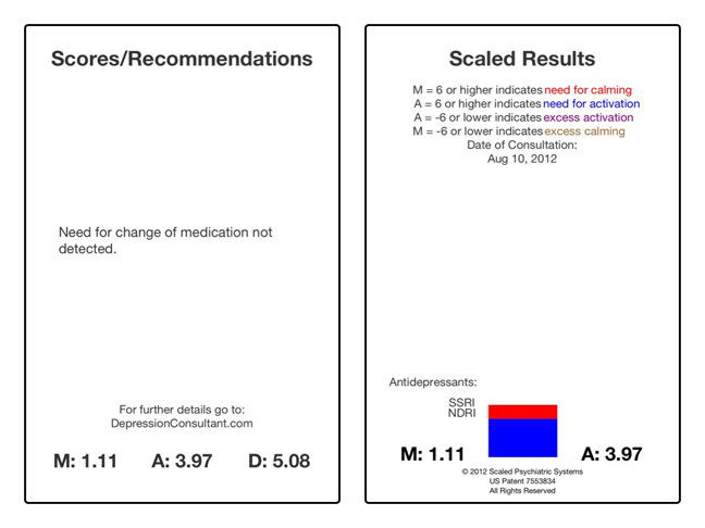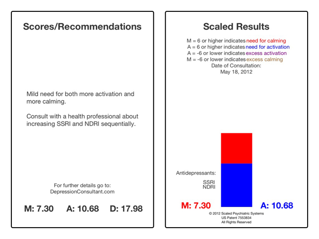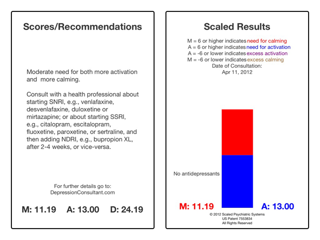 April 11, 2012 Jane is a 62 year old married woman who was referred by her primary care physician six months ago for evaluation of depression. She had presented a history of prior treatment with sertraline (Zoloft) but didn't think she needed it again at that time. Today she presents with significantly increased sadness, anxiety and fatigue, which she attributes to increased financial stress. The Clinaptica Depression Consultant app (Figure 1)finds a moderate level of depression (D=24.19) with a need for both calming (M=11.19) and activation (A=13.00) and recommends SNRI or SSRI+NDRI treatment. We elect to start her back on her previous SSRI at 50mg daily and see how she does.