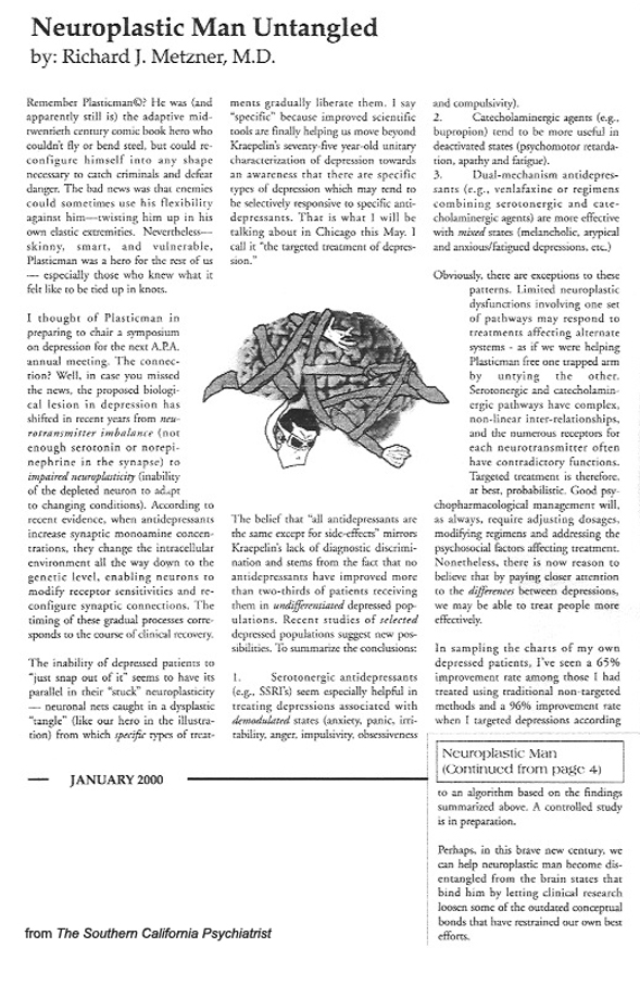 "Neuroplastic Man Untangled," the article that introduced the concept of personalized treatment of depression, was published in The Southern California Psychiatrist, January, 2000.